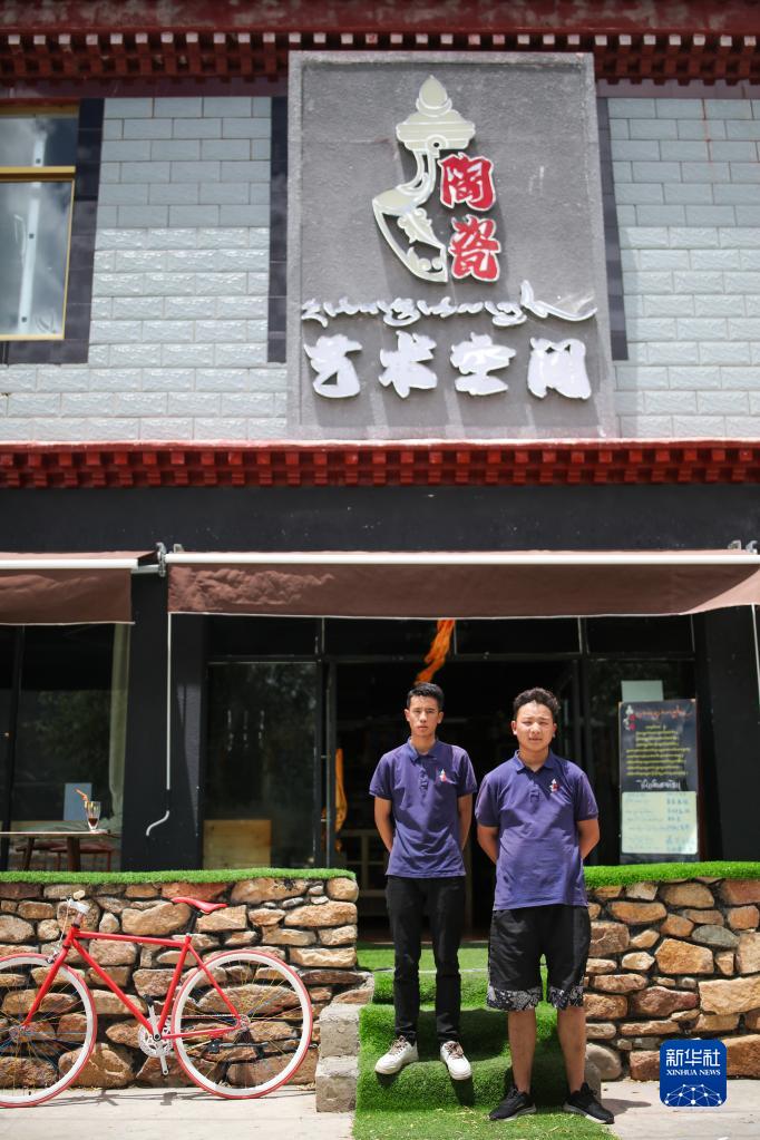 洛桑益西(左)與學徒在藏餐店門前(6月23日攝)。新華社記者 姜帆 攝