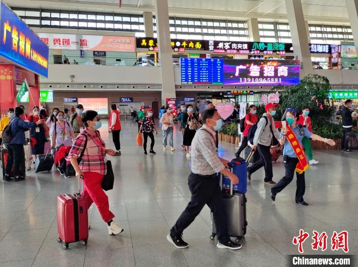 圖為西寧車(chē)站工作人員引導(dǎo)乘坐首趟暑期進(jìn)藏旅游專(zhuān)列的旅客進(jìn)站?;艚饌?攝