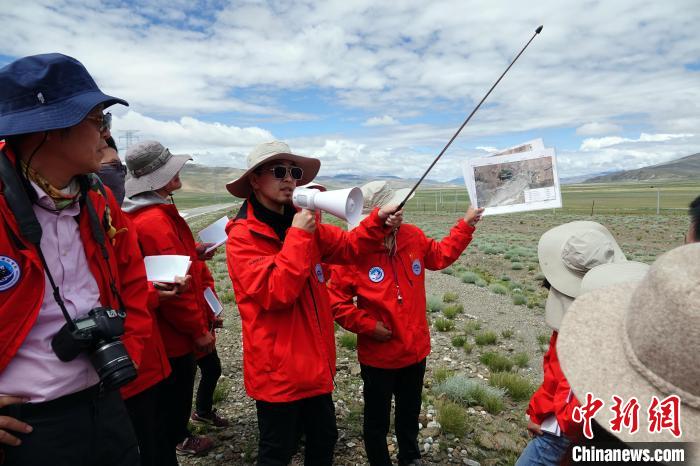 科考隊(duì)員、中國科學(xué)院青藏高原研究所張帥博士在古湖底分析講解瑪不錯和嘎拉錯劇變之謎。中新社記者 孫自法 攝