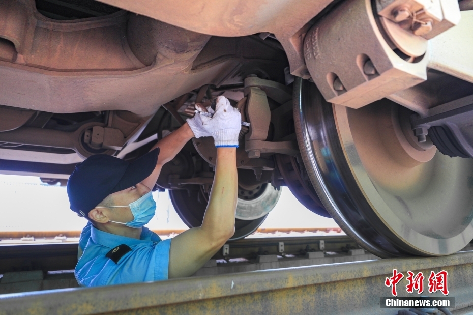 8月17日,北京車輛段北京西庫(kù)檢車間內(nèi),檢修人員對(duì)時(shí)速160公里動(dòng)力集中型復(fù)興號(hào)動(dòng)車組(俗稱“綠巨人”)的走行部進(jìn)行檢修。這里是京津冀地區(qū)唯一的“綠巨人”檢修維修基地,肩負(fù)著18列共計(jì)261節(jié)車輛的檢修任務(wù)。隨著暑運(yùn)逐漸迎來返校返程高峰,檢修人員也在加班加點(diǎn)為列車做好體檢工作,確保運(yùn)行安全。 中新社記者 賈天勇 攝