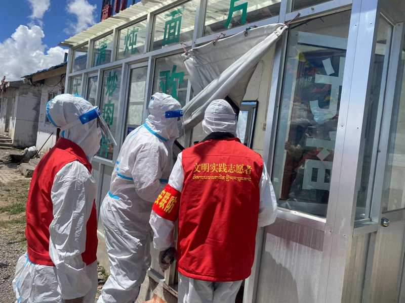 那曲市安多縣帕那鎮(zhèn)新時代文明實踐所志愿者對商鋪進(jìn)行消殺。圖片由那曲市文明辦提供