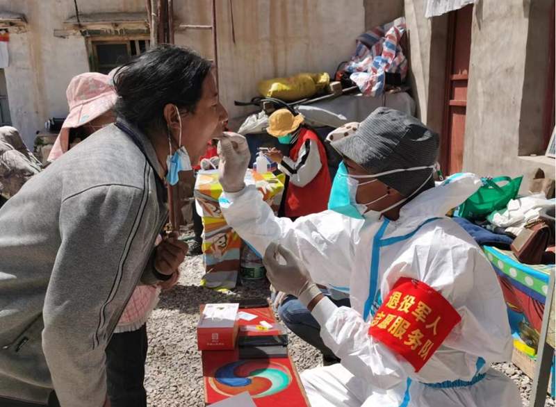 退役軍人志愿服務(wù)隊為群眾進(jìn)行核酸采樣。圖片由阿里地區(qū)改則縣新時代文明實踐中心提供
