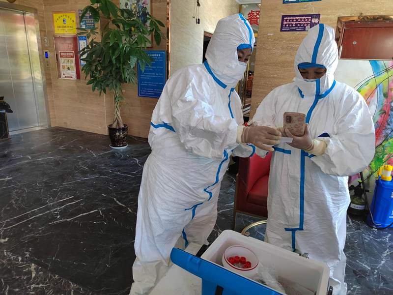 林芝市朗縣防疫人員到牧區(qū)進(jìn)行核酸采樣工作。圖片由林芝市文明辦提供