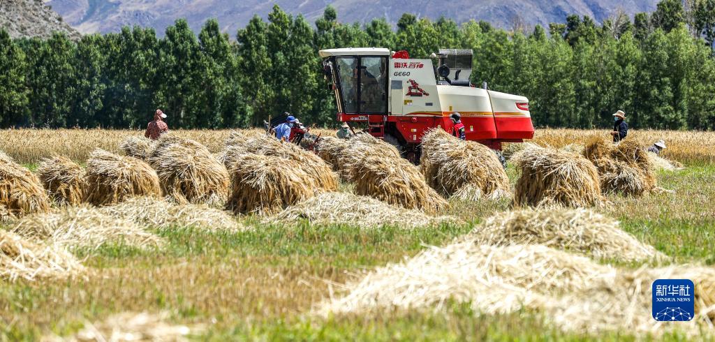 農(nóng)機合作社和收割工作隊在林周縣邊林鄉(xiāng)當杰村玉沖組搶收小麥(9月6日攝)。新華社記者 姜帆 攝