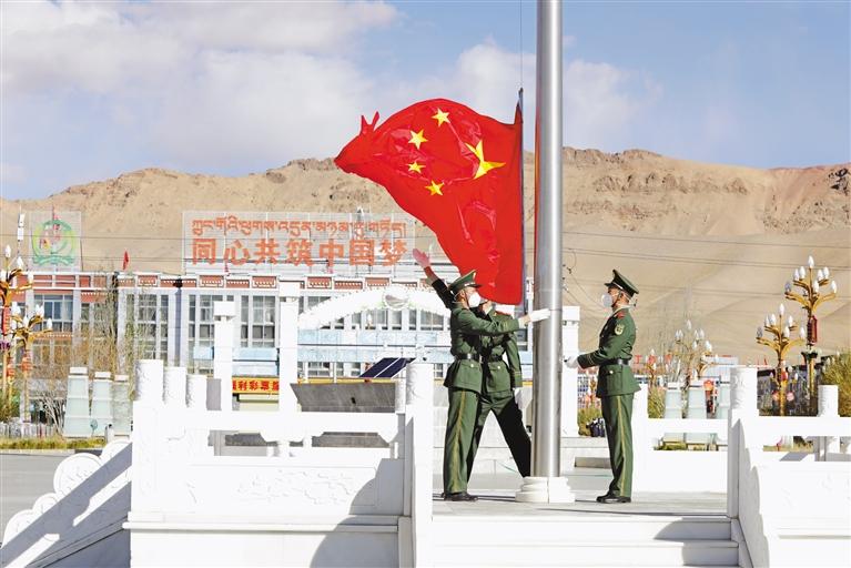 拉薩市堆龍德慶區(qū)的門堆村和崗吉村組織全體村干部舉行線上線下升國旗儀式,鮮艷的五星紅旗冉冉升起,飄揚(yáng)在村委會上空。嘹亮的國歌聲中,鮮艷的國旗下,莊嚴(yán)肅穆的氛圍里,熱愛祖國、奮發(fā)圖強(qiáng)的情感在每個(gè)人心中激蕩。