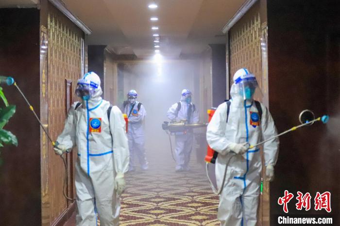西藏森林消防隊員對隔離酒店進行覆蓋式消殺。 西藏森林消防總隊 供圖