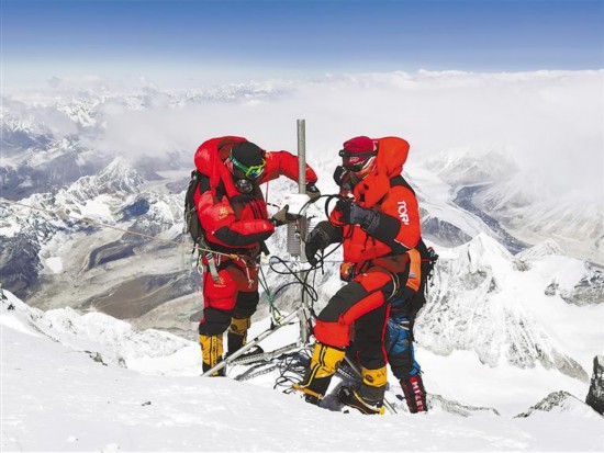 配合開展國家第二次青藏高原綜合科學考察研究,助推西藏自治區(qū)加快建設(shè)生態(tài)文明高地。圖為2022年5月4日,珠峰科考登頂隊員在珠穆朗瑪峰海拔8830米處成功架設(shè)全球海拔最高的自動氣象站。