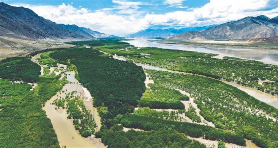 持續(xù)開展國土綠化行動,大美西藏生態(tài)持續(xù)良好。截至2021年底,全區(qū)森林覆蓋率達12.31%,草原綜合植被覆蓋度達47.53%,全區(qū)環(huán)境空氣質(zhì)量優(yōu)良率達99.8%,地表水質(zhì)達標率100%。圖為雅魯藏布江山南段沿線通過植樹造林形成的長160公里、平均寬約1.8公里的綠色長廊。