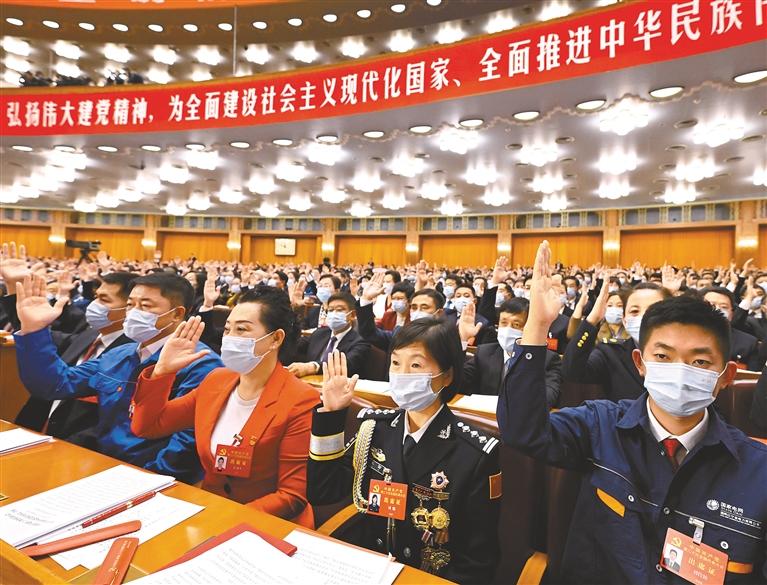 圖為10月22日,中國共產(chǎn)黨第二十次全國代表大會在北京人民大會堂勝利閉幕。這是代表舉手表決。新華社記者 申宏 攝
