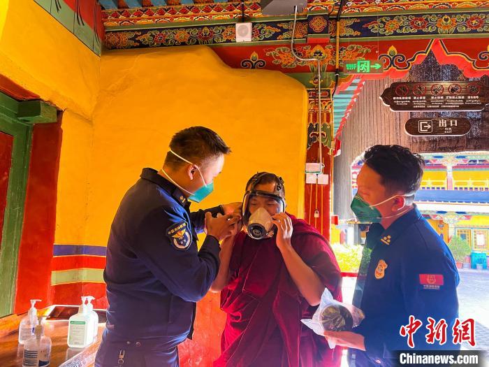 圖為消防員指導(dǎo)僧人學(xué)習(xí)佩戴防煙防毒面具?!±_市消防救援支隊供圖