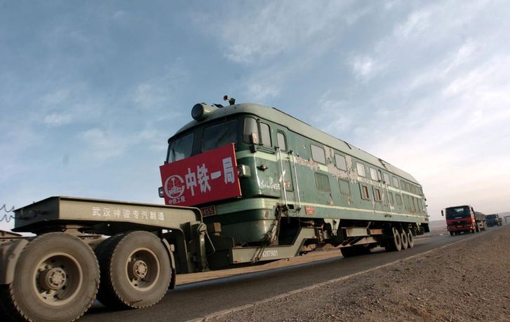 2005年4月19日,一輛汽車上裝著一輛機車,從青海省格爾木市秀水河車站經(jīng)過青藏公路向西藏安多方向行駛。青藏鐵路建設(shè)總指揮部從2004年3月開始陸續(xù)把近200臺機車、鋪軌機、架橋機、軌道車等大型鋪架設(shè)備用汽車從格爾木安全運抵西藏安多,途中翻越海拔5231米的唐古拉山埡口,創(chuàng)造了鐵路建設(shè)史上的奇跡。