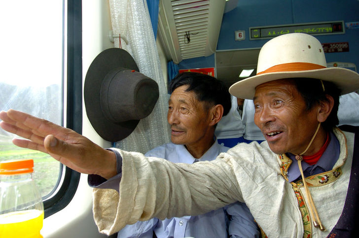 2006年7月1日,烏金(右一)在“藏2”次列車經(jīng)過自己家鄉(xiāng)安多時,興奮地指向車外,向同伴介紹。