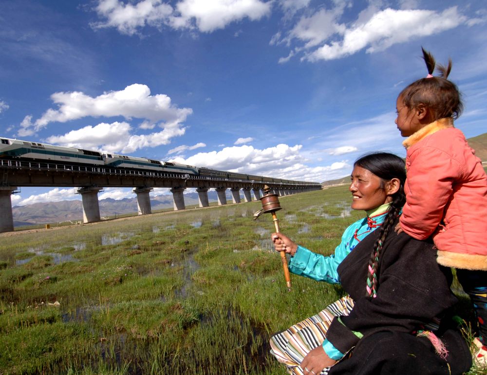 2006年青藏鐵路通車之際,我拍攝了拉薩市當(dāng)雄縣公塘鄉(xiāng)甲根村牧民白瑪拉姆。當(dāng)時,她手搖轉(zhuǎn)經(jīng)筒,背著女兒,靜坐在草原上,看著火車從自家門口駛過——祖祖輩輩放牧的她怎么也想不到能在自家門口見到呼嘯的火車。