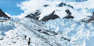科研人員行走在海拔5900多米的冰磧壟上。郭永杰攝(人民視覺(jué))