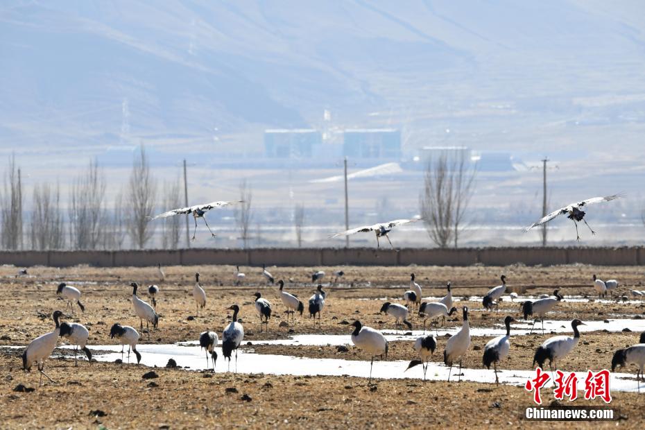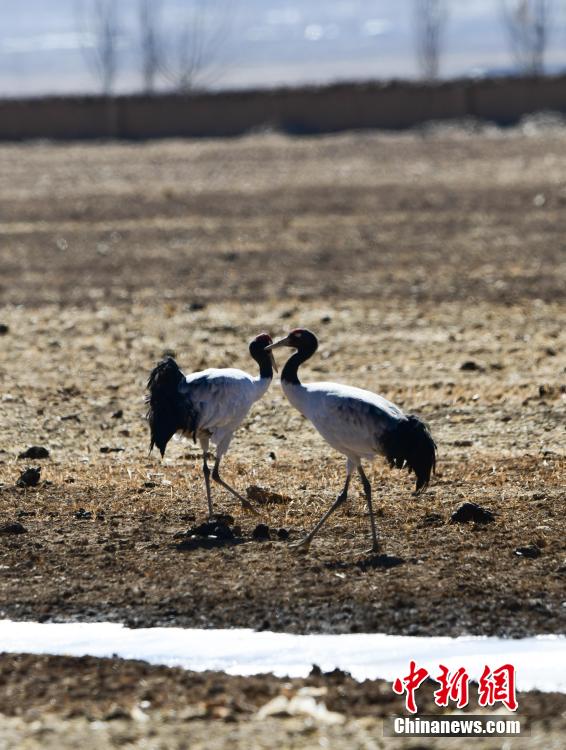 每年的10月底,成群的黑頸鶴飛到西藏拉薩市林周縣越冬,在拉薩市林周縣周邊的湖泊濕地度過5個(gè)月的“閑云野鶴”生活,次年三四月份再飛向藏北草原繁殖。黑頸鶴是世界上唯一一種高原鶴類。具有足長(zhǎng)、喙長(zhǎng)、頸長(zhǎng)的典型涉禽類特征,適合在沼澤地里行走。黑頸鶴的頸、尾為黑色,體羽為灰白色。黑頸鶴是國(guó)家一級(jí)保護(hù)動(dòng)物。目前,每年到林周縣越冬的黑頸鶴已達(dá)2000只左右。圖為黑頸鶴在林周境內(nèi)的農(nóng)田里覓食、嬉戲。 貢嘎來松 攝