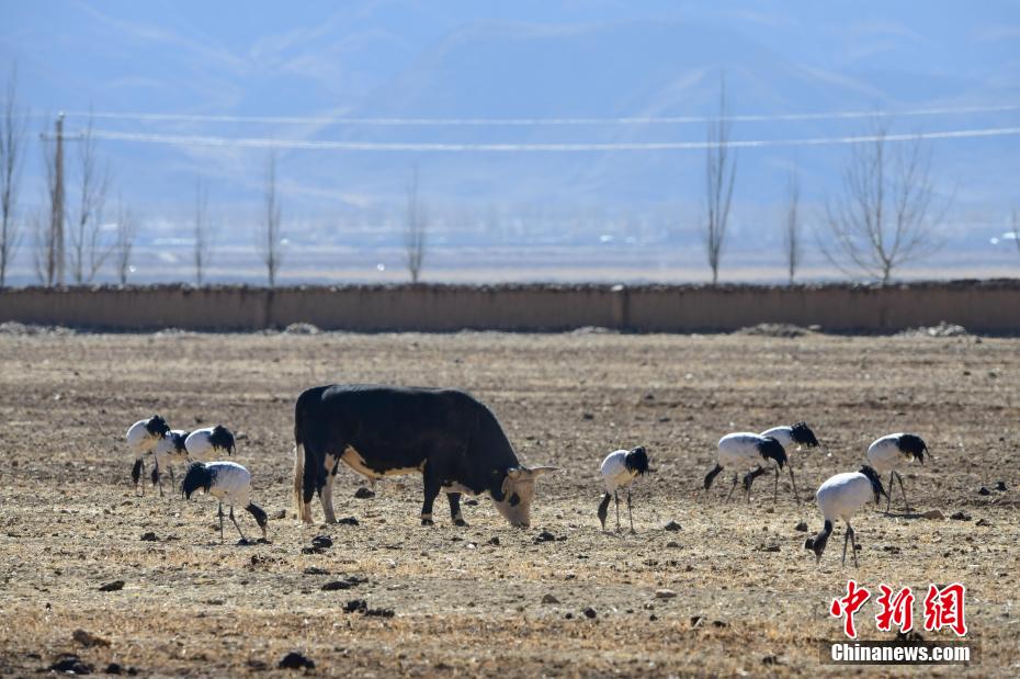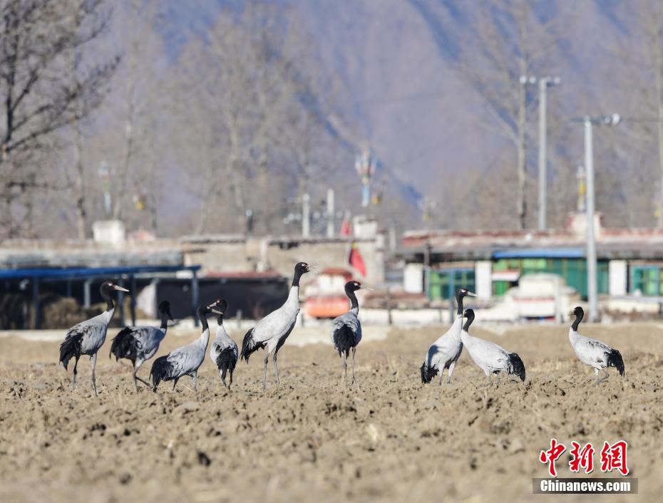 每年的10月底,成群的黑頸鶴飛到西藏拉薩市林周縣越冬,在拉薩市林周縣周邊的湖泊濕地度過5個(gè)月的“閑云野鶴”生活,次年三四月份再飛向藏北草原繁殖。黑頸鶴是世界上唯一一種高原鶴類。具有足長(zhǎng)、喙長(zhǎng)、頸長(zhǎng)的典型涉禽類特征,適合在沼澤地里行走。黑頸鶴的頸、尾為黑色,體羽為灰白色。黑頸鶴是國(guó)家一級(jí)保護(hù)動(dòng)物。目前,每年到林周縣越冬的黑頸鶴已達(dá)2000只左右。圖為黑頸鶴在林周境內(nèi)的農(nóng)田里覓食。 貢嘎來松 攝