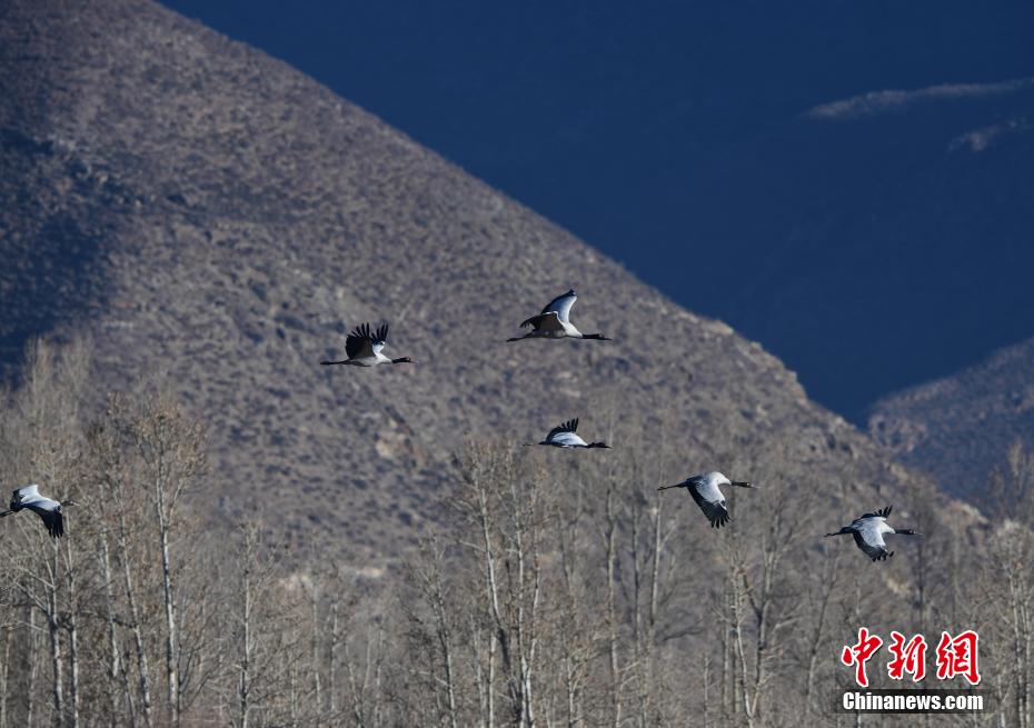 每年的10月底,成群的黑頸鶴飛到西藏拉薩市林周縣越冬,在拉薩市林周縣周邊的湖泊濕地度過5個月的“閑云野鶴”生活,次年三四月份再飛向藏北草原繁殖。黑頸鶴是世界上唯一一種高原鶴類。具有足長、喙長、頸長的典型涉禽類特征,適合在沼澤地里行走。黑頸鶴的頸、尾為黑色,體羽為灰白色。黑頸鶴是國家一級保護(hù)動物。目前,每年到林周縣越冬的黑頸鶴已達(dá)2000只左右。圖為黑頸鶴在林周境內(nèi)的農(nóng)田上空飛翔。 貢嘎來松 攝