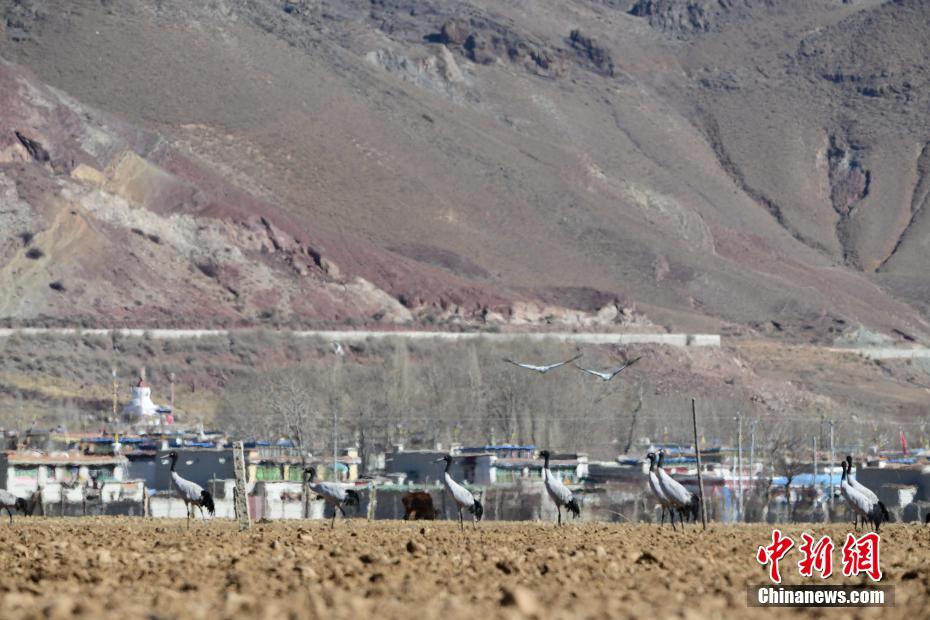 每年的10月底,成群的黑頸鶴飛到西藏拉薩市林周縣越冬,在拉薩市林周縣周邊的湖泊濕地度過5個月的“閑云野鶴”生活,次年三四月份再飛向藏北草原繁殖。黑頸鶴是世界上唯一一種高原鶴類。具有足長、喙長、頸長的典型涉禽類特征,適合在沼澤地里行走。黑頸鶴的頸、尾為黑色,體羽為灰白色。黑頸鶴是國家一級保護(hù)動物。目前,每年到林周縣越冬的黑頸鶴已達(dá)2000只左右。圖為黑頸鶴在林周境內(nèi)的農(nóng)田里覓食。 貢嘎來松 攝