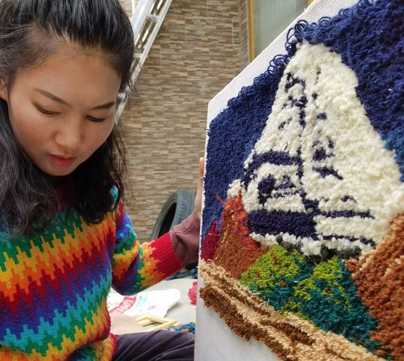 不過(guò),起初也遇到了不少困難和挑戰(zhàn)?!鞍⒓褌儯ú卣Z(yǔ):對(duì)年長(zhǎng)女性的尊稱)的編織手藝都很棒,但她們幾乎沒(méi)上過(guò)學(xué),拘泥于傳統(tǒng)思維,創(chuàng)新力不足,做出來(lái)的產(chǎn)品花樣陳舊,一直打不開市場(chǎng)。而且她們對(duì)很多新鮮事物的接受度低,不愿意改變。比如她們只做色彩鮮艷的氆氌(藏族人民手工生產(chǎn)的一種毛織品,可做衣服、床毯等)。我想打破慣常思維,做一些時(shí)髦的產(chǎn)品出來(lái)?!贝稳是浠貞?。