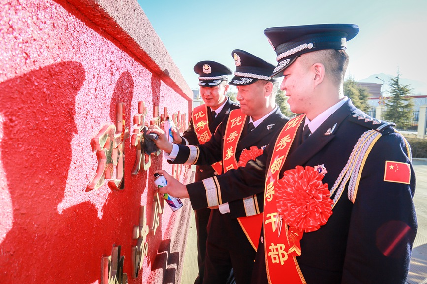 圖為1月10日,拉薩鐵路公安處功模代表共同為“四句話、十六字”訓(xùn)詞墻描紅,擦亮忠誠底色。胡傳鑫攝