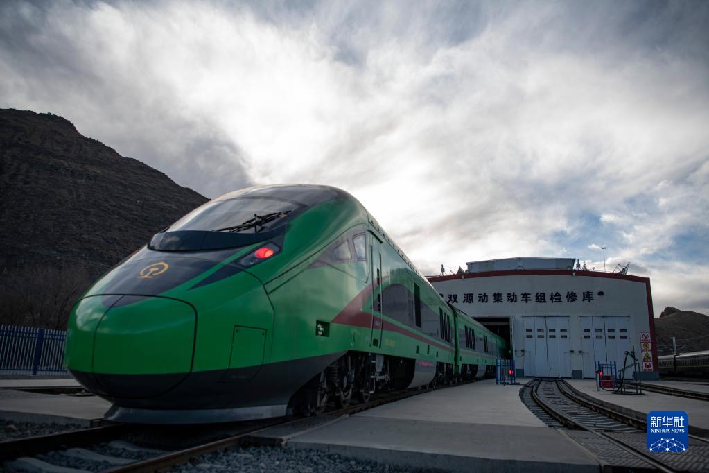 在拉薩機(jī)輛整備中心,動(dòng)車組在檢修庫(kù)進(jìn)行整備作業(yè)(1月10日攝)。新華社記者 孫非 攝