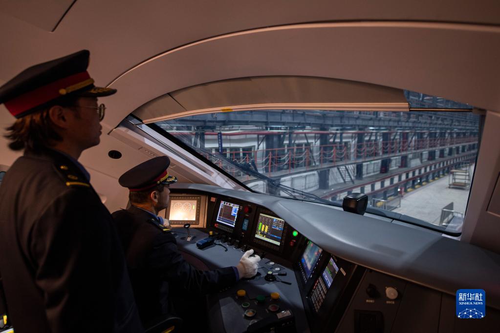 在拉薩機(jī)輛整備中心,黃起崗將動(dòng)車組駛?cè)胪\囄恢茫?月11日攝)。新華社記者 孫非 攝