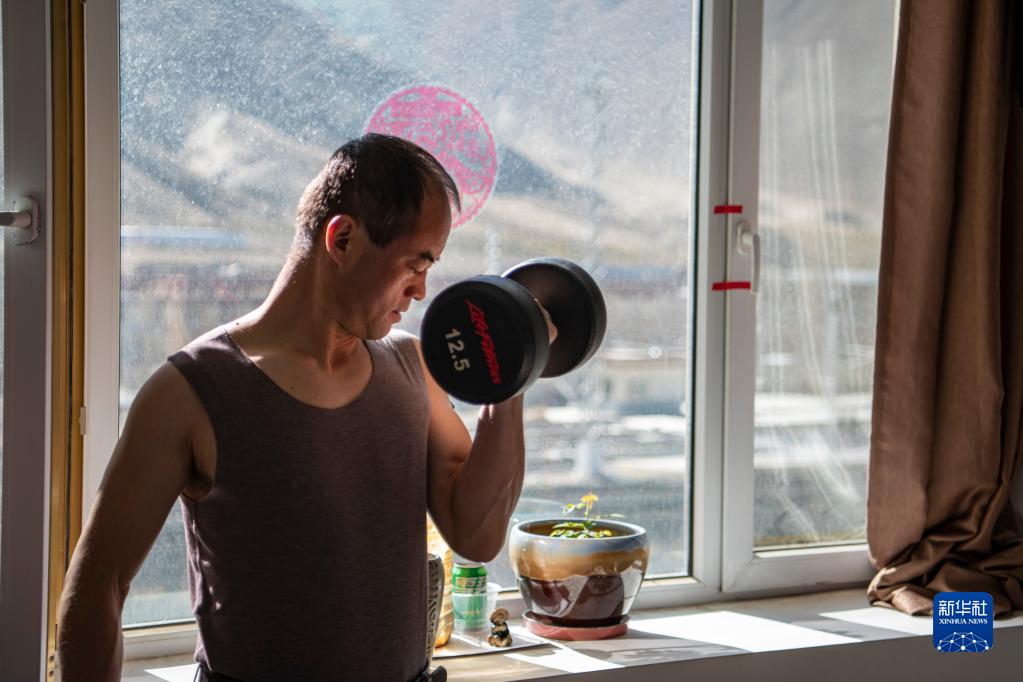 在拉薩機(jī)輛整備中心的宿舍里,黃起崗利用空閑時(shí)間鍛煉身體(1月11日攝)。新華社記者 孫非 攝