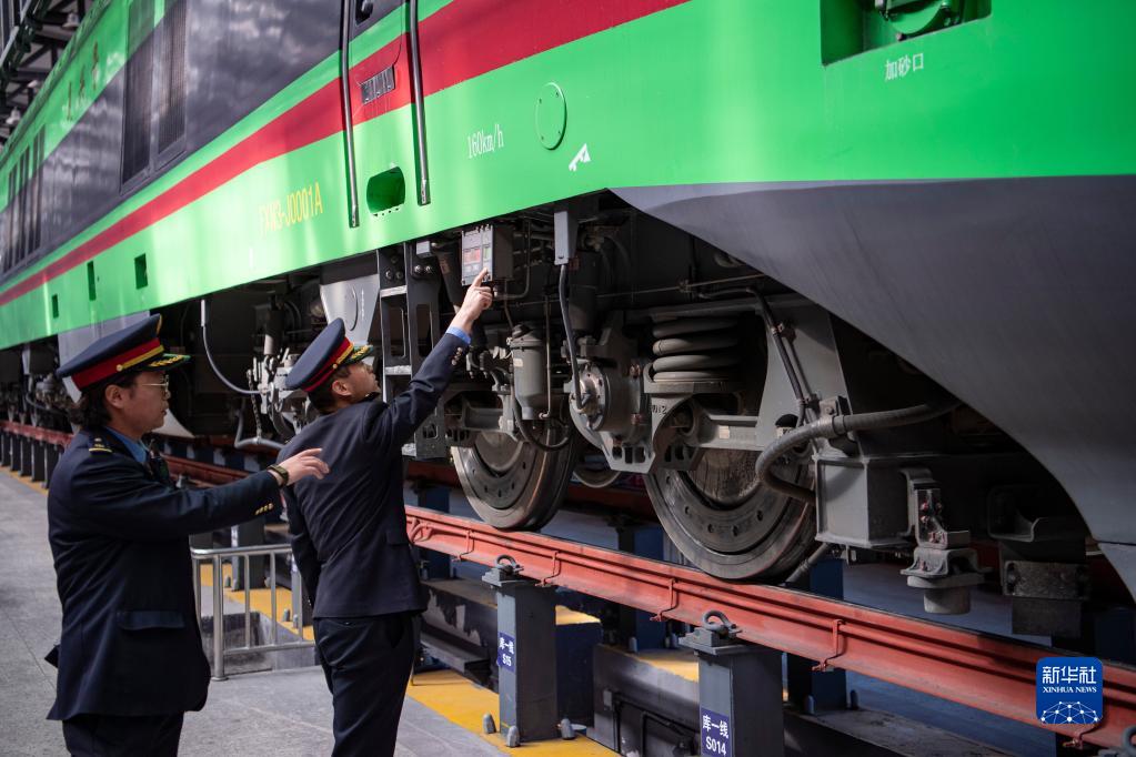 在拉薩機(jī)輛整備中心,黃起崗(右)和同事對(duì)動(dòng)車組進(jìn)行走行部檢查(1月11日攝)。新華社記者 孫非 攝