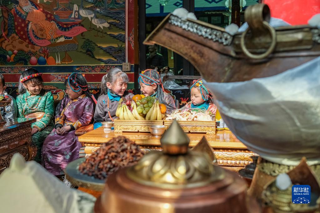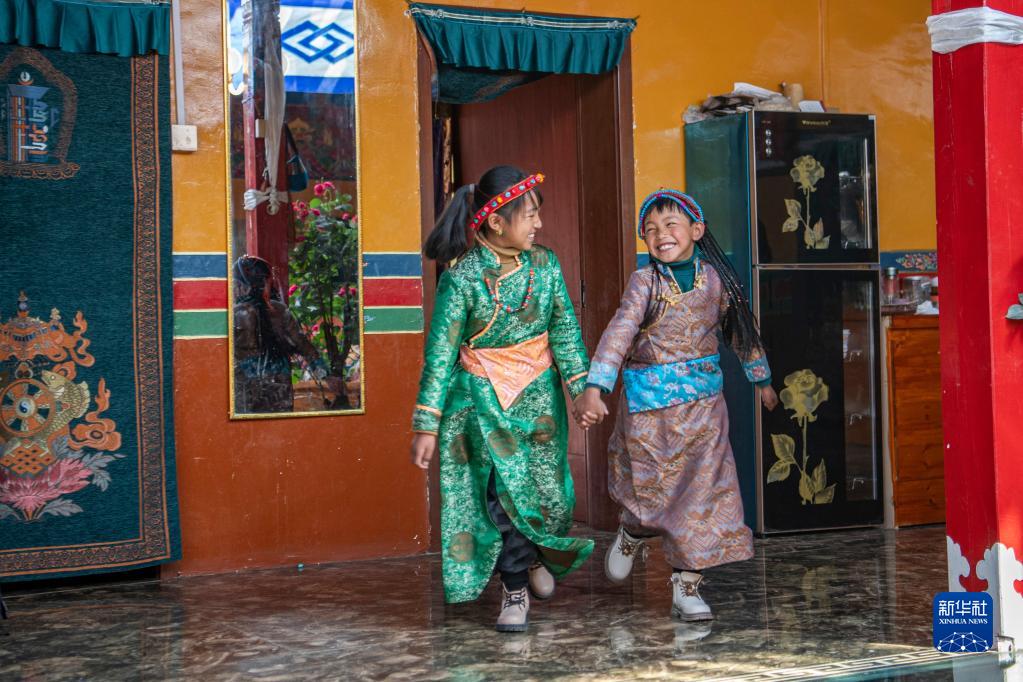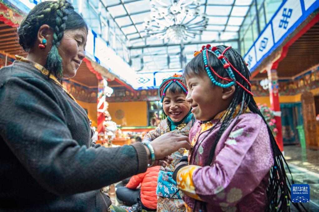 今年,日喀則藏歷農家年和春節(jié)“巧遇”同一天,雖習俗不同,但年味皆濃。次旦的兒孫早早開車去縣城采買了年貨,兒媳婦們在家準備過年吃的羊頭、切瑪等傳統(tǒng)特色美食。家中的第四代,次旦老人的重孫子和重孫女們,則穿上了漂亮的藏裝,頭戴綠松石點綴的頭飾,在家中歡快地跑來跑去。