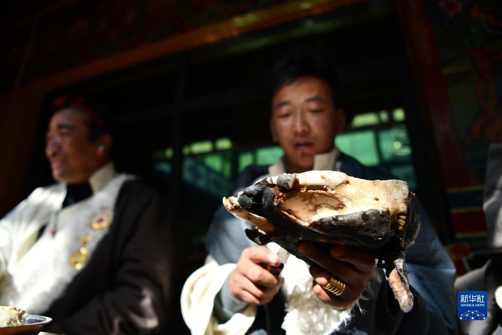 次旦老人孫子在吃過年必吃的傳統(tǒng)特色美食羊頭(1月22日攝)。新華社記者 晉美多吉 攝