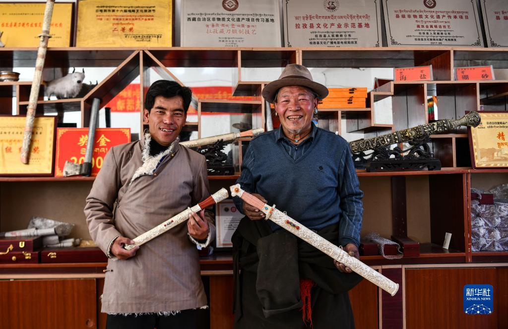 普達(dá)瓦(右)和兒子多吉占堆一起展示制作好的拉孜藏刀(1月19日攝)。新華社記者 晉美多吉 攝