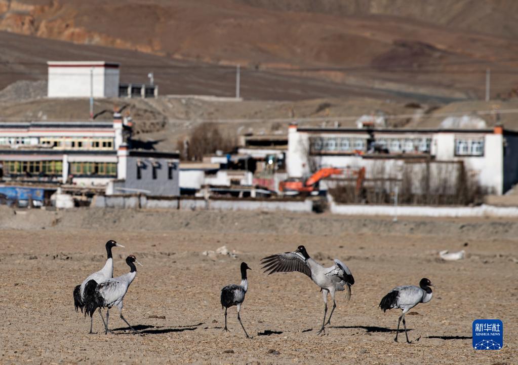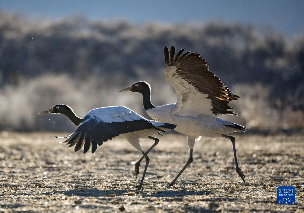 在西藏雅魯藏布江中游河谷黑頸鶴國家級(jí)自然保護(hù)區(qū)日喀則市拉孜縣越冬的黑頸鶴(1月19日攝)。新華社記者 晉美多吉 攝