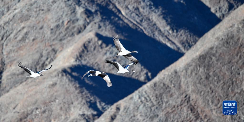 在西藏雅魯藏布江中游河谷黑頸鶴國家級(jí)自然保護(hù)區(qū)日喀則市拉孜縣越冬的黑頸鶴(1月23日攝)。新華社記者 晉美多吉 攝
