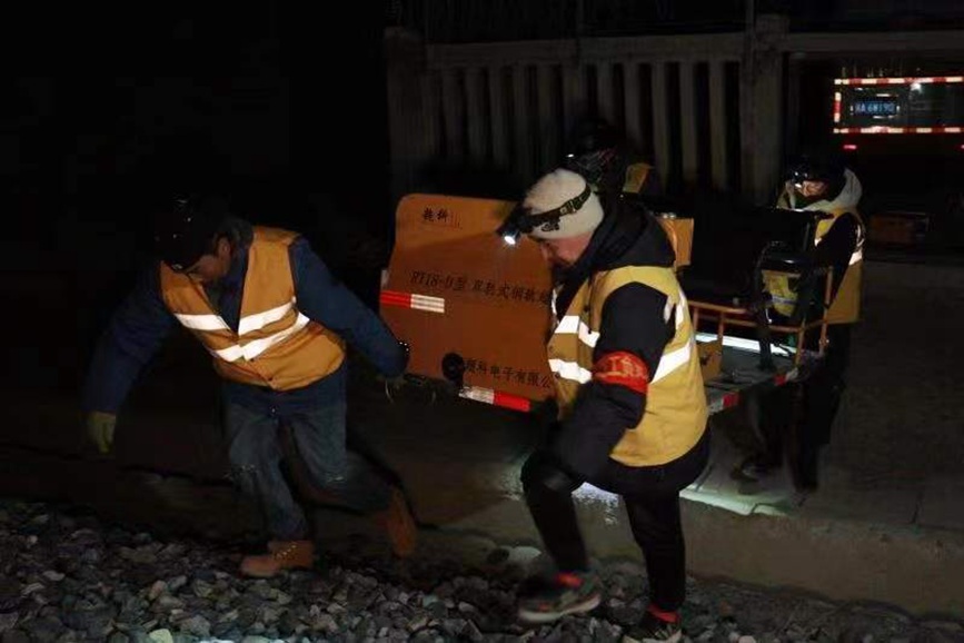 “大家?guī)Ш霉ぞ卟牧?,準備出發(fā)。”22時整,隨著作業(yè)負責(zé)人探傷工區(qū)工長羅布一聲令下,呼嘯的寒風(fēng)中,黃色的“迷你敞篷車”緩緩啟動,載著4名職工,開始了當(dāng)晚對拉林鐵路20多公里線路的探傷檢查任務(wù)。