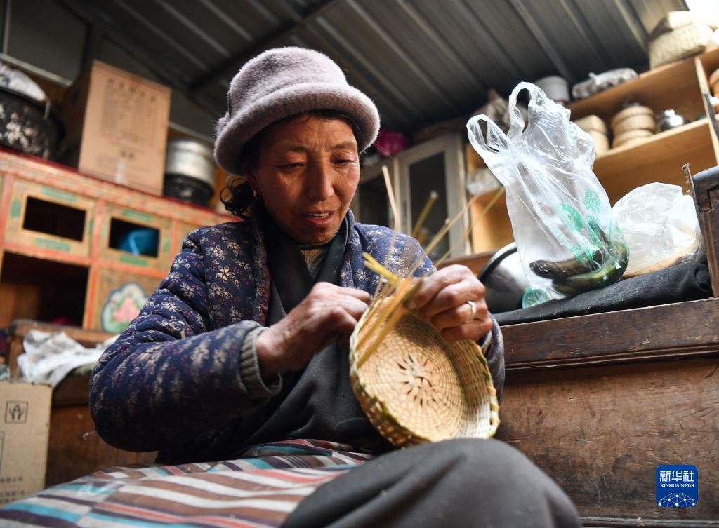 卓嘎在編織竹籃(2023年1月8日攝)。新華社記者 晉美多吉 攝