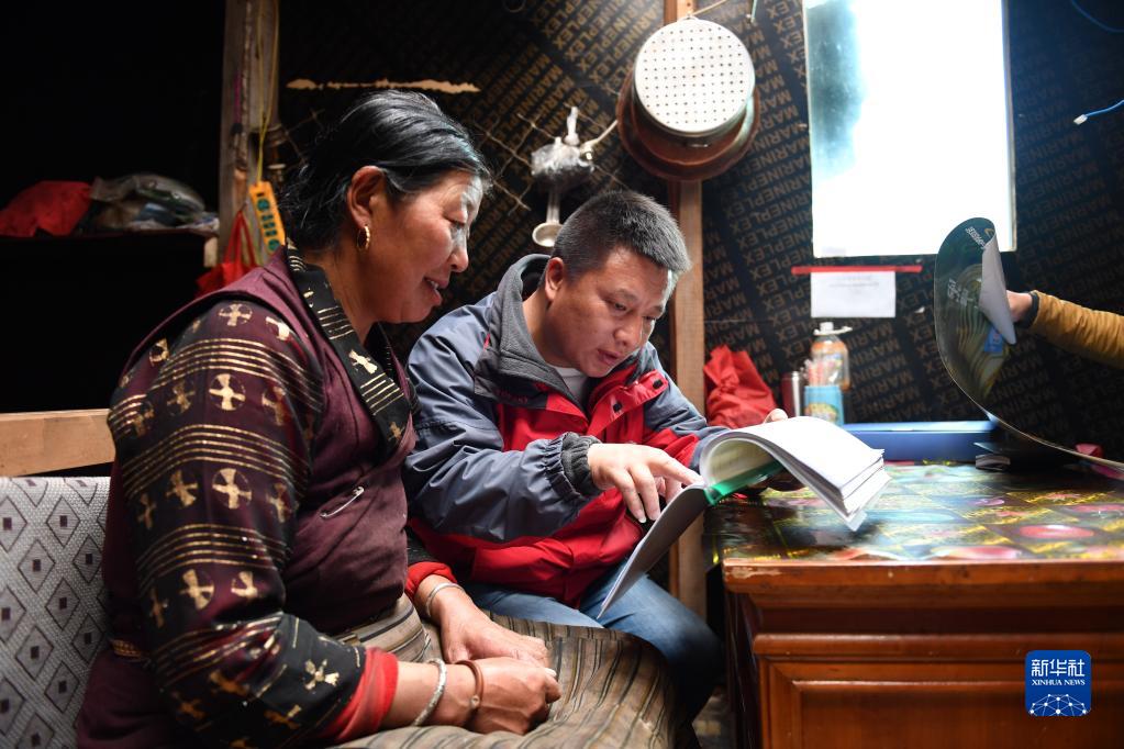山南市社保工作人員在央宗家中為她補(bǔ)充登記社保信息,并介紹社保政策(2018年5月24日攝)。新華社記者 晉美多吉 攝
