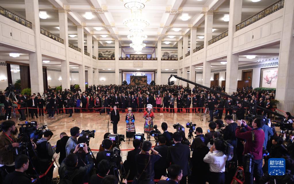 2018年3月11日,十三屆全國(guó)人大一次會(huì)議在北京人民大會(huì)堂舉行第三次全體會(huì)議,全國(guó)人大代表卓嘎(中)在“代表通道”接受采訪。新華社記者 王建華 攝