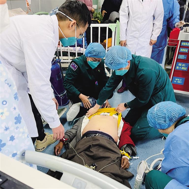 急診科值班醫(yī)生陳勝、副護士長趙文熠等立即攜搶救車、除顫儀趕赴現(xiàn)場,此時,冬某意識喪失、頸動脈搏動消失、呼吸極其微弱。見患者病情危及生命,醫(yī)護人員立即實施搶救工作。急診醫(yī)護團隊配合默契,胸外心臟按壓、球囊輔助通氣、建立靜脈通道、靜推腎上腺素、查心電圖、監(jiān)測生命體征、吸痰……一切有條不紊地進行著。隨后,心電圖提示室顫,醫(yī)護人員立即予以非同步200J電除顫1次,待轉運床到位后立即轉運患者至搶救室進一步救治,轉運過程中心肺復蘇不間斷。