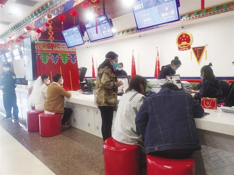 14日一大早,記者在拉薩三級政務服務大廳婚姻登記處看到,大廳里坐滿了前來登記領證的情侶,工作人員正在有序地為新人辦理證件。記者注意到,前來登記領證的新人或手捧鮮花,或頭戴白紗,或好友一路跟拍,臉上洋溢著幸福的笑容。為了營造浪漫的節(jié)日氛圍,婚姻登記處的工作人員也在大廳和禮堂內精心擺放了寓意為“百年好合”的百合花。