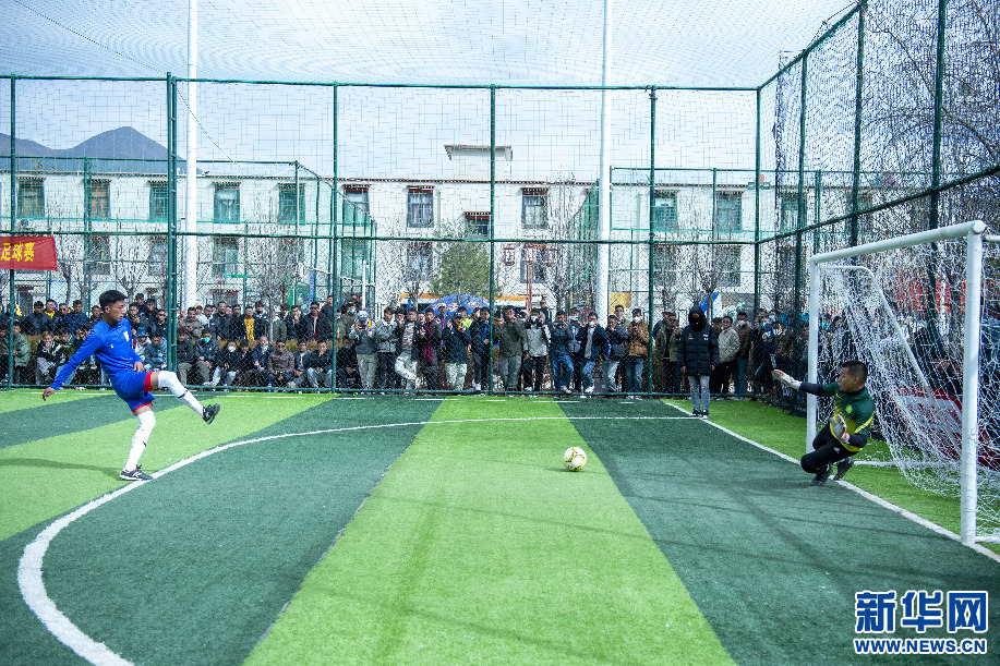 2月14日,巔炯邁瓦隊(duì)球員在點(diǎn)球大戰(zhàn)中射門(mén)。新華網(wǎng) 旦增努布 攝
