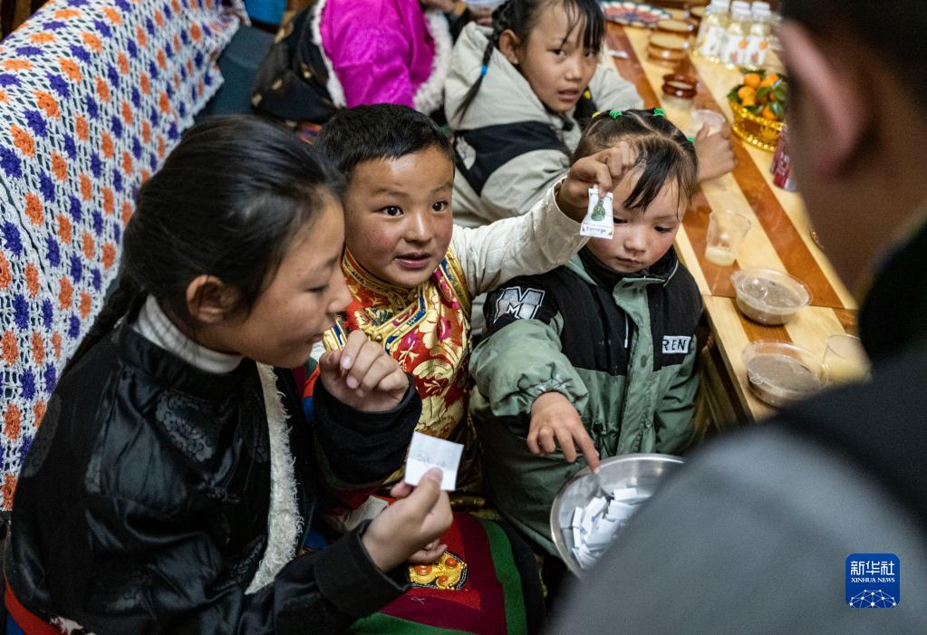 在位于森布日安置點的家中,石秀次仁家的孩子們在向家人展示自己隨機(jī)拿取的小紙條。畫在紙條上的圖案有著不同的寓意(2月19日攝)。
