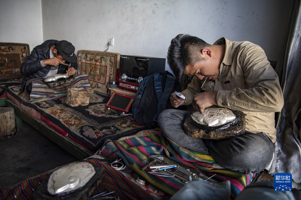 在扎西吉彩金銀銅器加工廠工人正在檢查打制的銀器坯子(3月9日攝)。新華社記者孫非 攝
