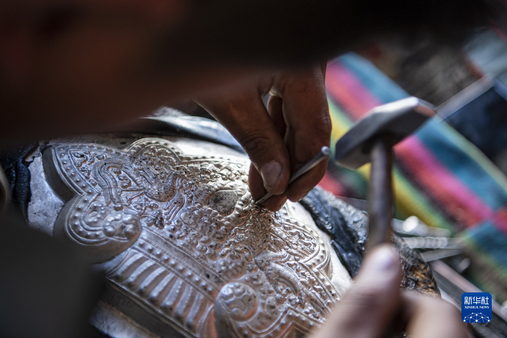 扎西吉彩金銀銅器加工廠工人正在給銀器鏨刻花紋(3月9日攝)。新華社記者孫非 攝