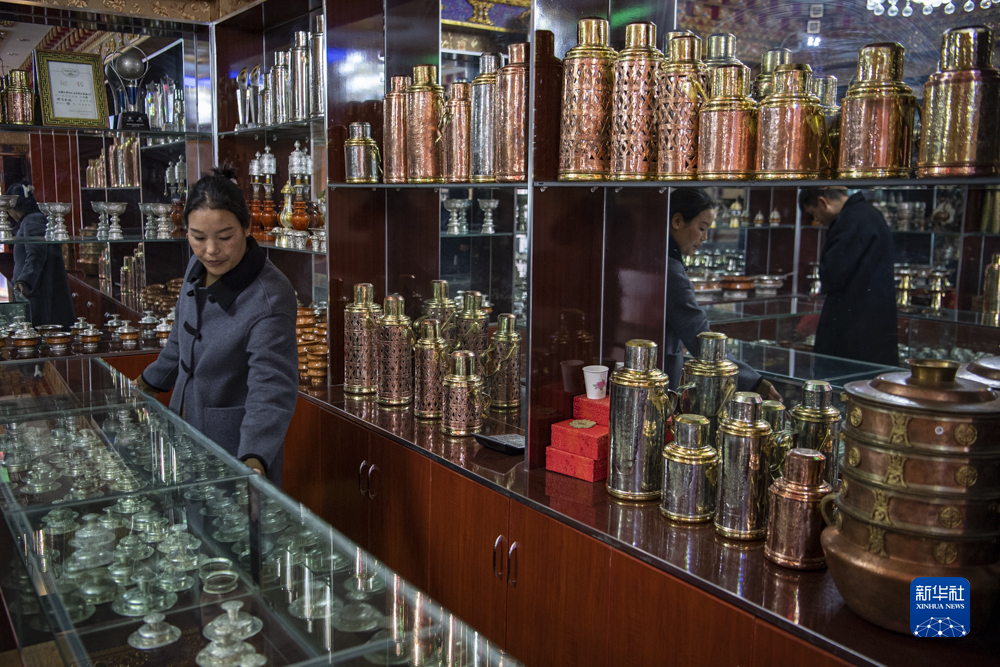 這是扎西吉彩金銀銅器加工廠的產(chǎn)品展示間(3月9日攝)。新華社記者孫非 攝
