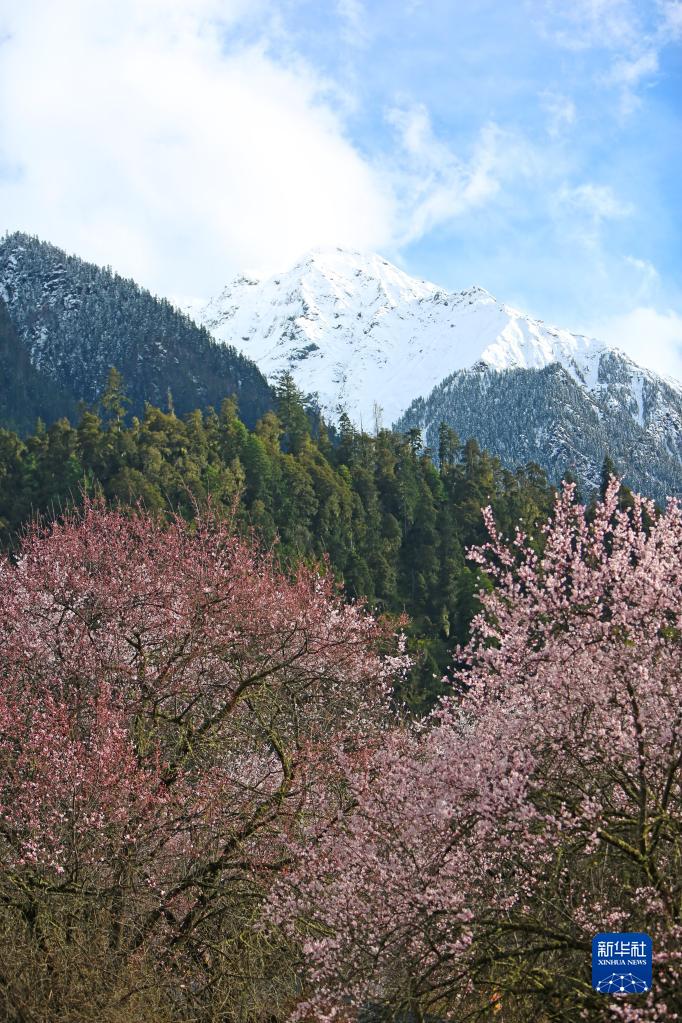 近日,林芝市波密縣古通村漫山遍野桃花盛開,與高原雪山相映成趣。