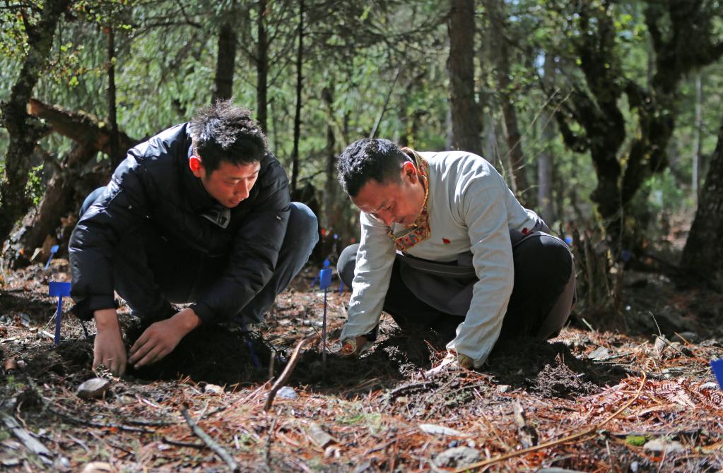 3月的波密,細雨綿綿,微微吹拂的春風中夾雜著青草與泥土的芳香,巴桑頓珠行走在茂密的樹林間,不時蹲下身子查看天麻種苗的生長情況。