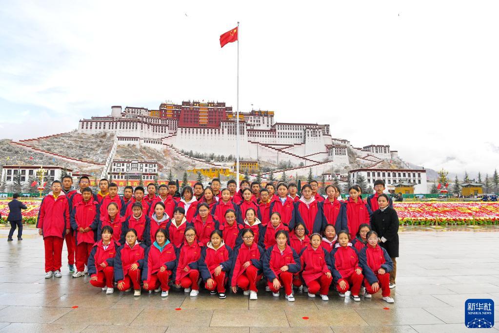 3月28日,在拉薩布達(dá)拉宮,參加升旗儀式的師生在廣場合影留念。新華社記者 張汝鋒 攝