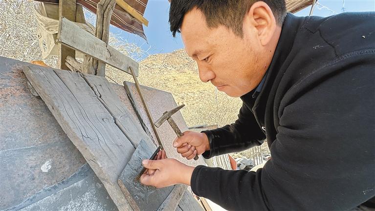 今年35歲的桑周才仁出生在石刻世家,父輩都是石匠,算起來他也是家族石刻技藝的第六代傳承人了。自幼,桑周才仁就對石頭有一種特殊的情感,14歲就開始接受父親的指導(dǎo),悉心學(xué)習(xí)刻字、線雕、浮雕、繪畫等與石刻相關(guān)的技藝。“刻字是石刻技藝中的基礎(chǔ),需要反復(fù)練習(xí),刻不好就得磨掉重做,直到刻出滿意的作品為止?!鄙V懿湃蕦τ浾哒f,當(dāng)時(shí)聽到父親一句“刻得很好”的評價(jià),他就能高興一整天。