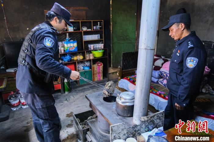 圖為西藏山南移民管理警察向軍(左)在公漳浦執(zhí)勤點(diǎn)為火爐添加風(fēng)干牦牛糞。 江飛波 攝
