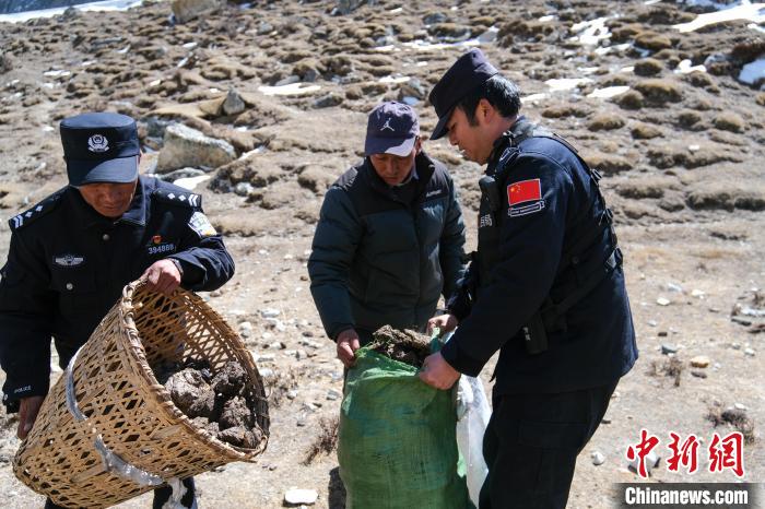 圖為4月6日,公漳浦執(zhí)勤民輔警等在草場(chǎng)收集風(fēng)干牦牛糞,當(dāng)作取暖燃料?!〗w波 攝